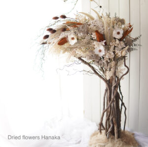 配送でのお届けになるので、ドライフラワーほどは花落ちの心配の少ないアーティフィシャルフラワーで制作。