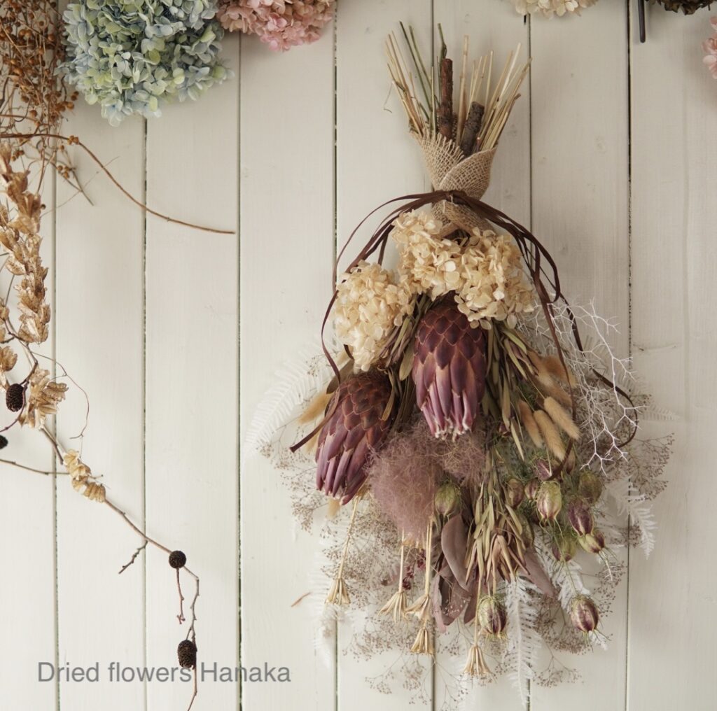 ワインレッドのプロテアヴィーナスをメインに使い、ニゲラのストライプやスモークツリーのニュアンスを引き立てるようなお花を重ねました。