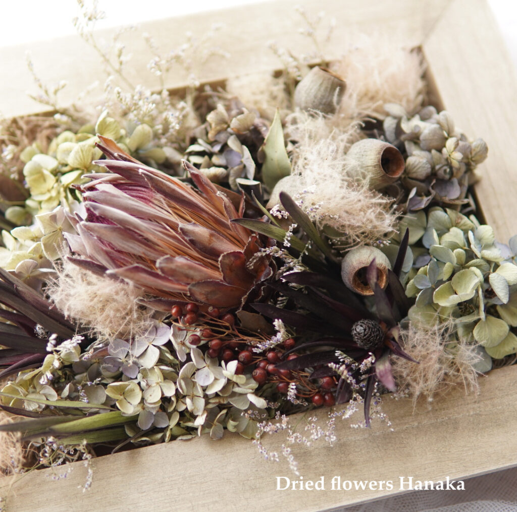 プロテアの絶妙な色味を活かせるよう、色合わせにこだわり、ゆっくりとアンティークカラーに褪色していくのもきっと楽しんでいただけると思います。