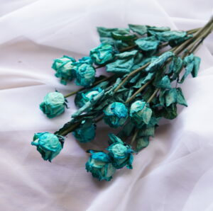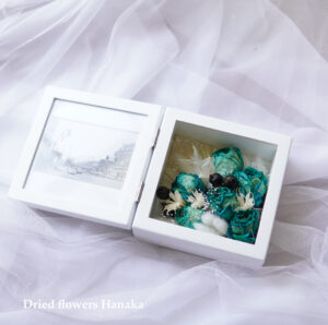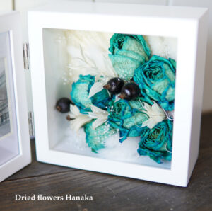 綺麗なターコイズブルーの薔薇の色を活かせるように、足す色は優しい白と引き立て役の黒のみにして、透明感のある作品に仕上げました。