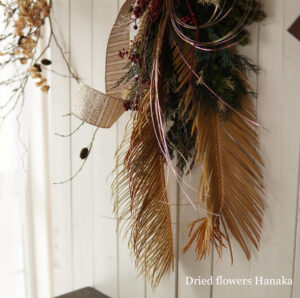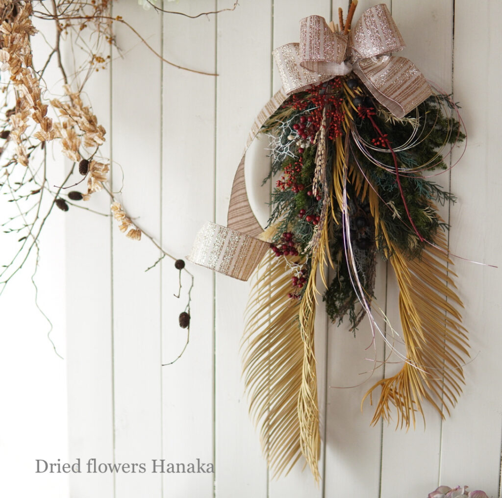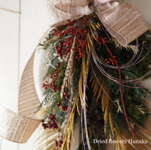 グリーンや南天の実、稲穂、ユーカリなどを飾り、ゴールドの大きなリボンと、カールした水引で仕上げました。