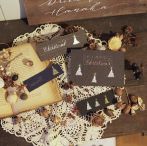 いつも来てくださるリピーターさんと、初めての方もいらして、みんなそれぞれ練習する文字は違う中、講師のokadaさんのわかりやすいレクチャーで、最後には素敵なカードを仕上げました。