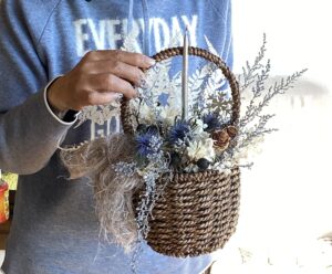 同じカゴのアレンジですが、アトリエでのワークショップとは少し違う、シルバーとブルーの効いたクールなデザインです。