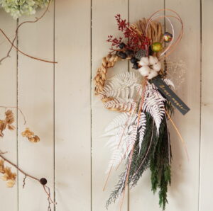 ホテイアオイのしめ縄に、コニファーの葉とヒメワラビをつけて、綿やハスの実で飾る、シックなデザインのお飾りです。