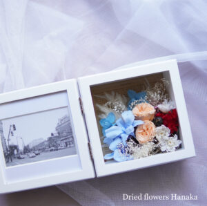ブルーのお好きなお嬢さまとのことで、ターコイズブルーや水色のお花をたくさん使ったので、白いフレームにアレンジして爽やかに仕上げました。