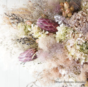 ナチュラルにゆっくりと褪色していくドライフラワーを集めて、少しだけグリーンも入れて、プロテアの色を効かせました。